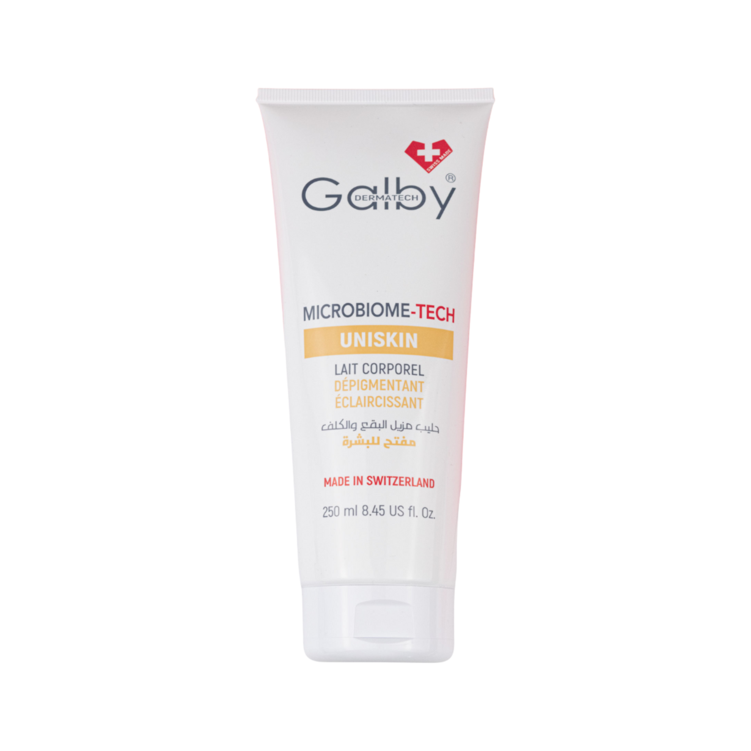 Lait Corporel Dépigmentant Eclaircissant UNISKIN de Galby Dermatech avec sa texture légère et soyeuse pour tout type de peau , combine la technologie du microbiome avec des actifs dépigmentant en assurant une hydratation profonde , pour une action complète. Il unifie le teint pour révéler une peau visiblement plus claire et lumineuse. Adoptez une routine de soin qui optimise votre éclat naturel tout en hydratant votre peau.